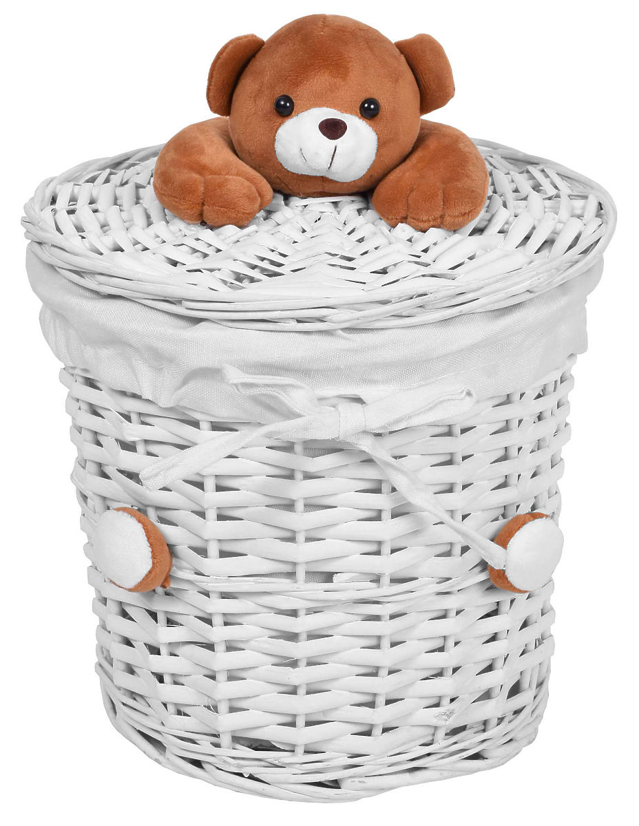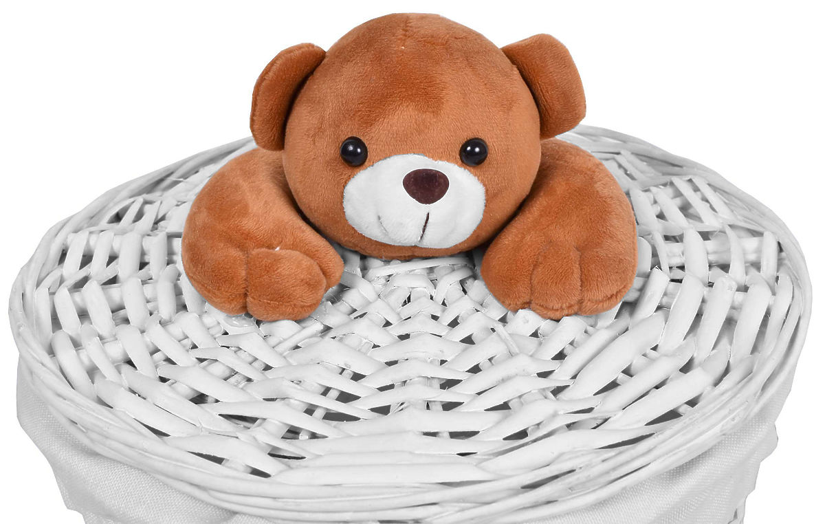 Il prodotto è realizzato in vimini con intreccio uniforme, all'interno è rivestito con un resistente materiale di lino color crema. Il coperchio è decorato con un orsetto di peluche morbido al tatto.