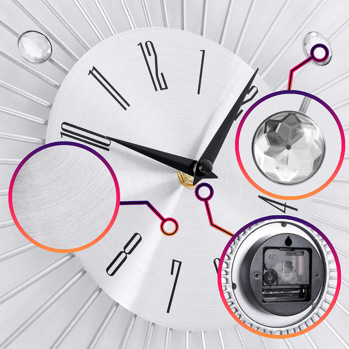 L'orologio da parete Cristal Moon non è solo uno strumento pratico per misurare il tempo, ma anche una decorazione eccezionale che aggiunge lucentezza al tuo interno. Grazie ai cristalli che diffondono la luce, porta un tocco di lusso e modernità nella stanza. Sono silenziosi, a risparmio energetico e facili da usare – basta una batteria per godere ogni giorno della loro bellezza e funzionalità.
